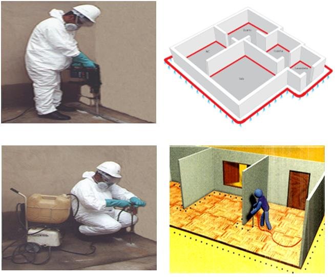 A injeção no foco trata cada ponto separadamente. Para se atingir o outro lado, é necessário tratar o solo abaixo da fundação, injetando o produto através do piso de cimento. A solução é aplicada em áreas onde os cupins entram na estrutura.